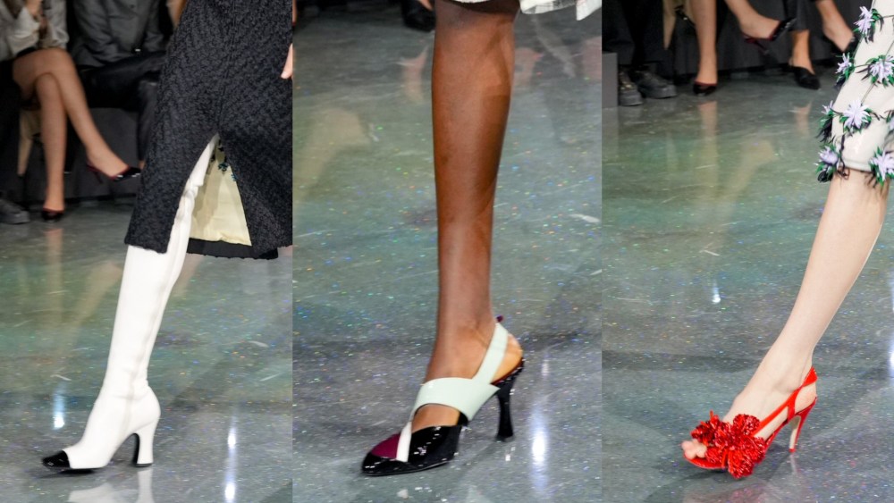 Multiple strap-based heel designs appeared throughout the show, including futuristic slingbacks that achieved their modern aesthetic through innovative strap arrangements and bold color-blocking techniques.
